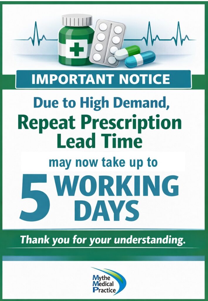 Due to high demand, the lead time for a repeat prescription may now take up to 5 working days.